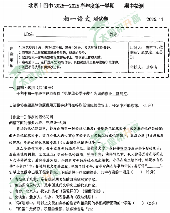 2025-2026学年第一学期北京十四中初一语文期中试卷及答案什么时候出?考哪些内容?如何下载?