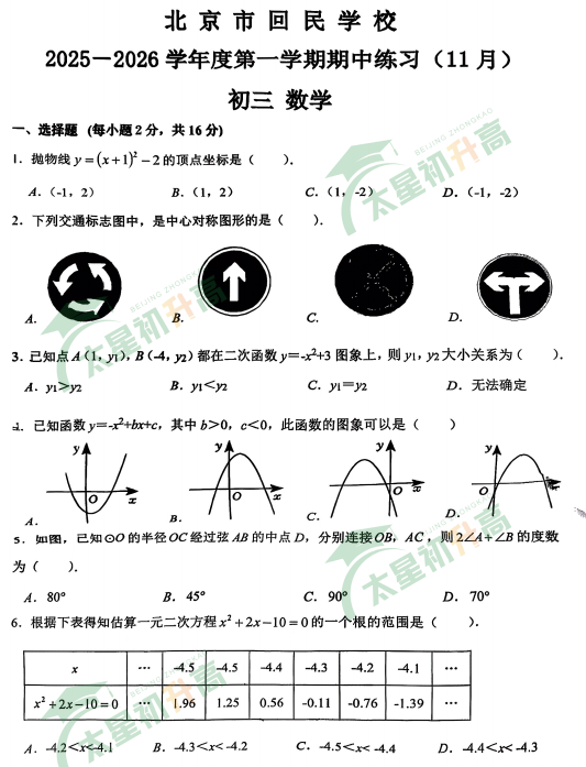 2025-2026学年第一学期北京回民学校初三数学期中试卷及答案什么时候出?考哪些内容?如何下载?