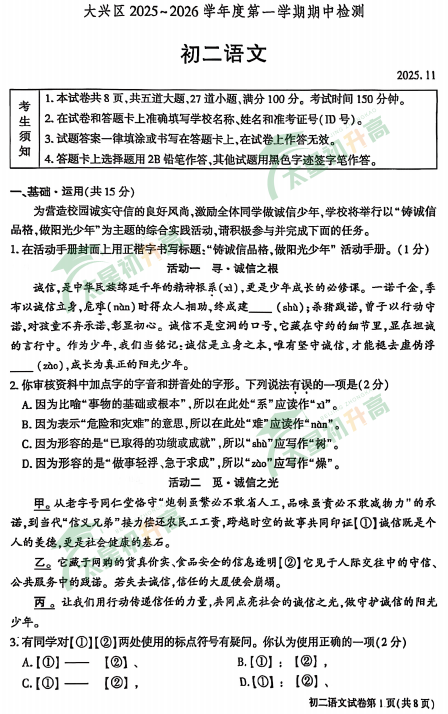 2025-2026学年(上)大兴区初二语文期中试卷已出!文末可直接下载试卷!