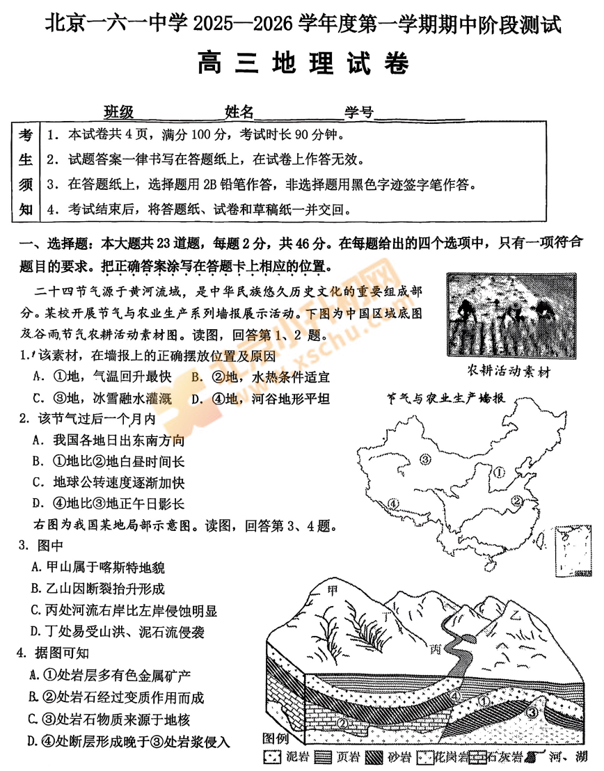 2025-2026学年第一学期北京一六一中学高三地理期中试卷及答案什么时候出?考哪些内容?如何下载?