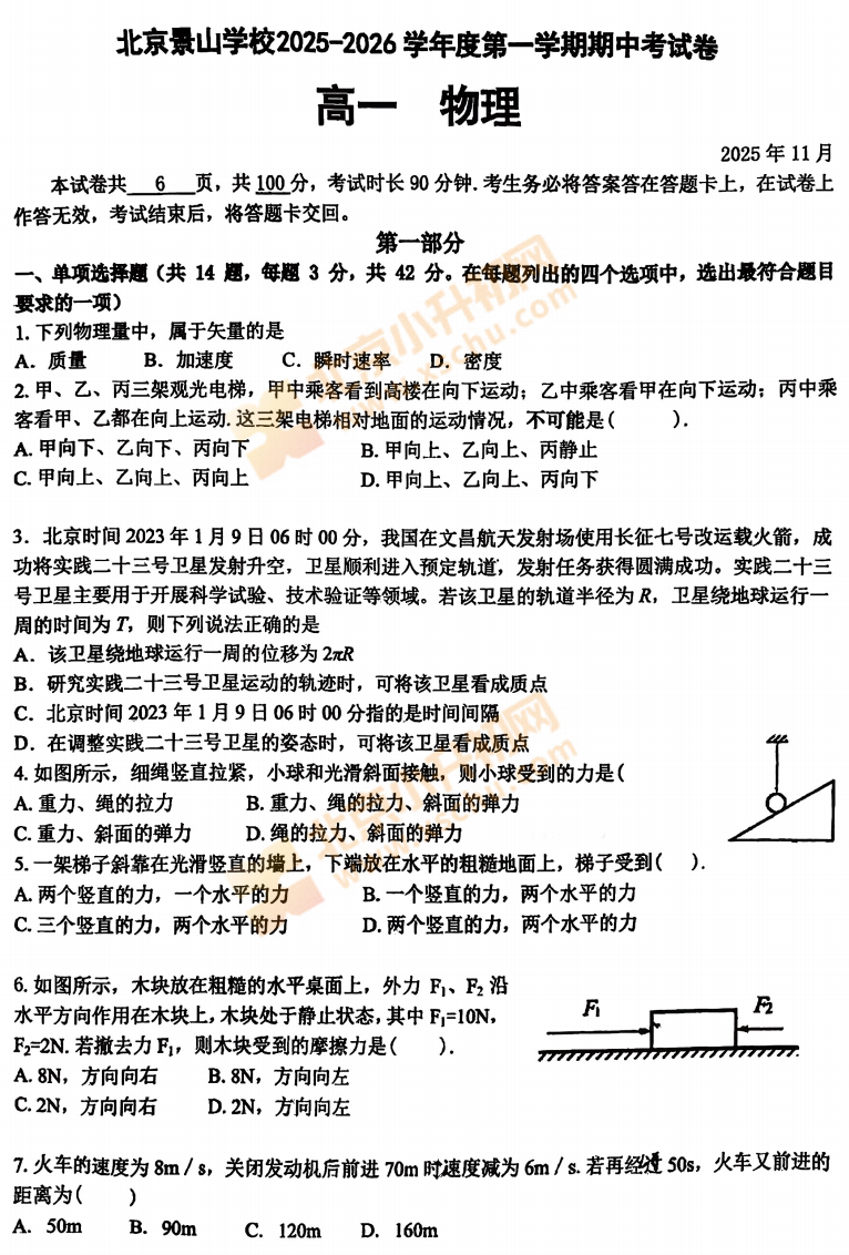 2025-2026学年第一学期景山学校高一物理期中试卷及答案什么时候出?考哪些内容?如何下载?