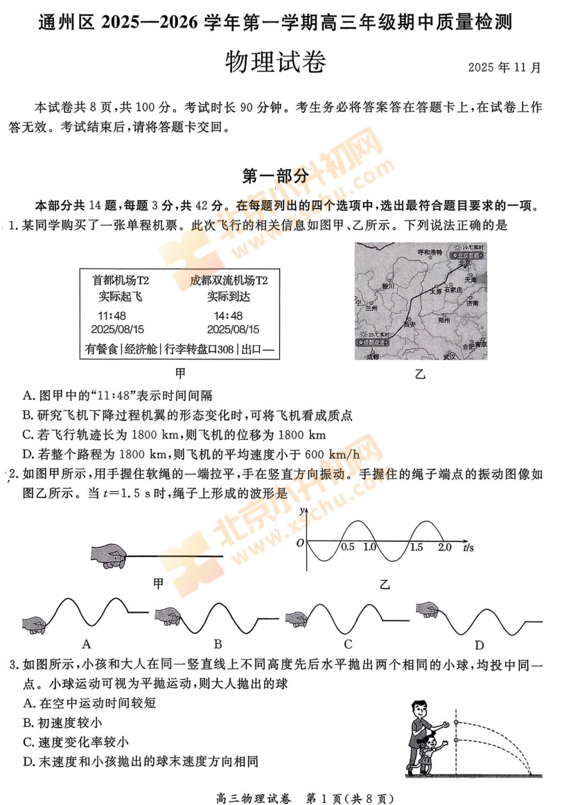2025-2026学年第一学期通州区高三物理期中试卷及答案什么时候出?考哪些内容?如何下载?