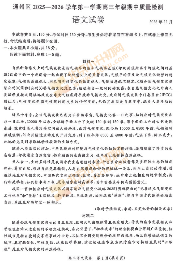 2025-2026学年第一学期通州区高三语文期中试卷及答案什么时候出?考哪些内容?如何下载?