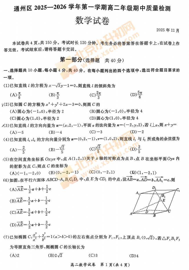 2025-2026学年第一学期通州区高二数学期中试卷及答案什么时候出?考哪些内容?如何下载?