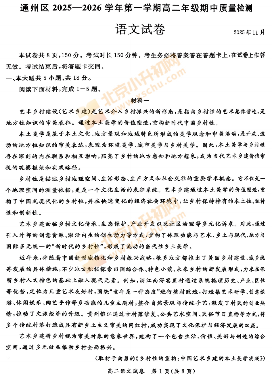 2025-2026学年第一学期通州区高二语文期中试卷及答案什么时候出?考哪些内容?如何下载?