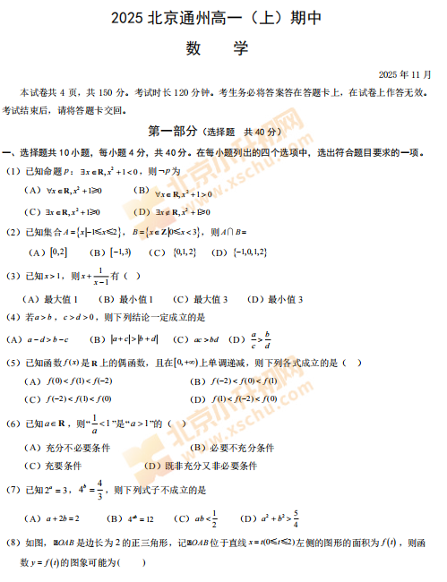 2025-2026学年第一学期通州区高一数学期中试卷及答案什么时候出?考哪些内容?如何下载?