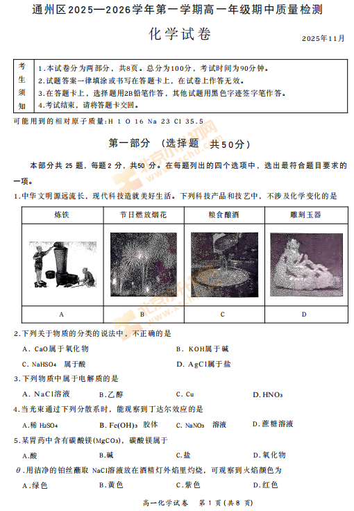 2025-2026学年第一学期通州区高一化学期中试卷及答案什么时候出?考哪些内容?如何下载?