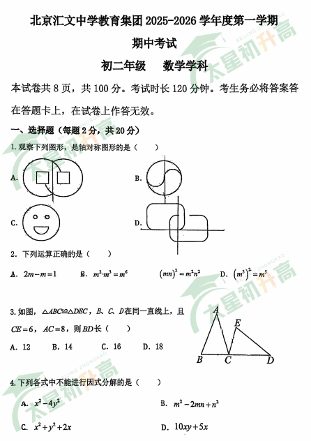 2025-2026学年第一学期东城区汇文中学初二数学期中试卷及答案什么时候出?考哪些内容?如何下载?