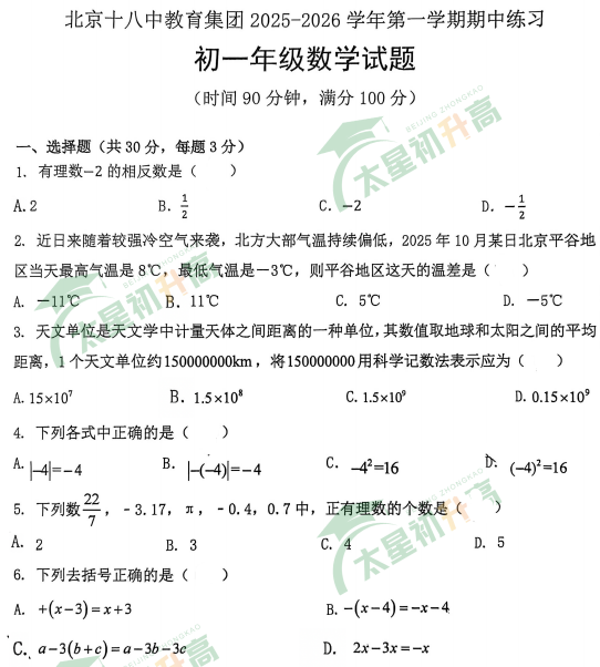 2025-2026学年第一学期北京十八中学初一数学期中试卷及答案什么时候出?考哪些内容?如何下载?