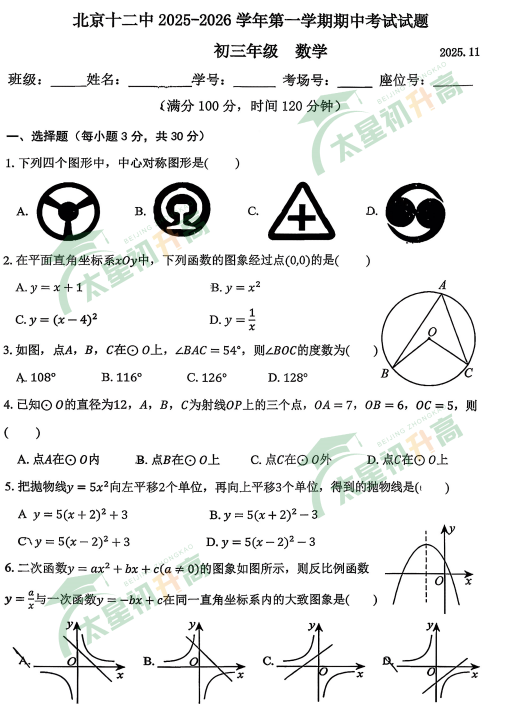 2025-2026学年第一学期北京十二中学初三数学期中试卷及答案什么时候出?考哪些内容?如何下载?