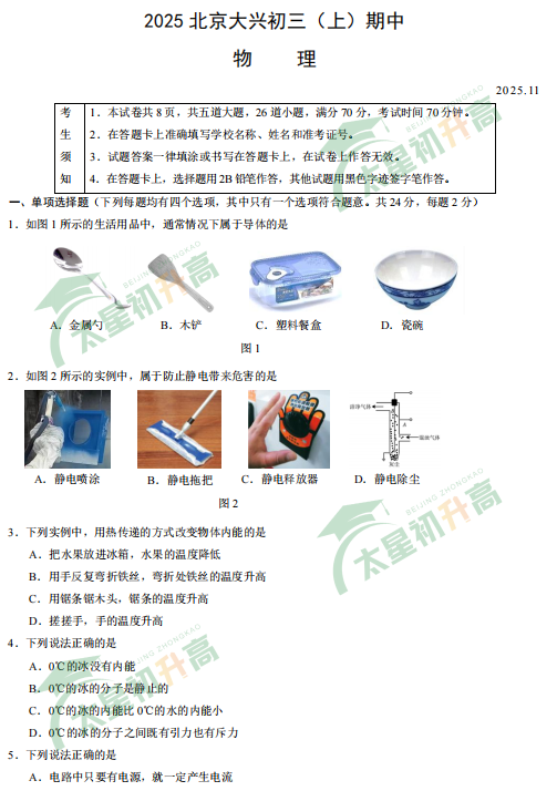 2025-2026学年(上)大兴区初三物理期中试卷已出!文末可直接下载试卷!