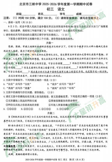 2025-2026学年(上)北京三帆中学初三语文期中试卷已出!文末可直接下载试卷!