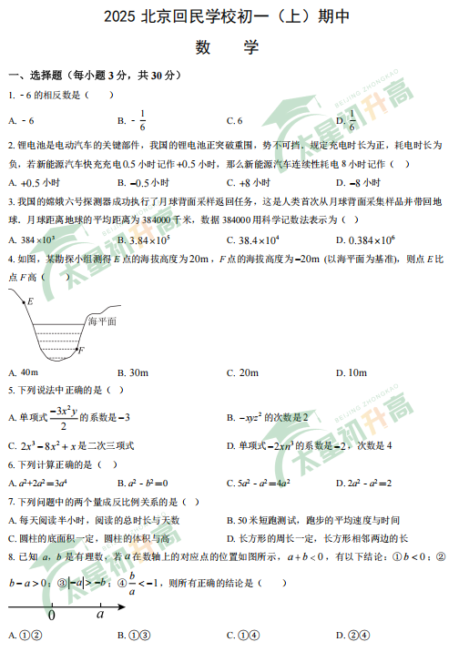 2025-2026学年第一学期北京回民学校初一数学期中试卷及答案什么时候出?考哪些内容?如何下载?