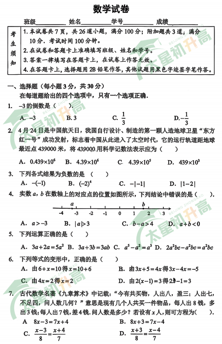 2025-2026学年第一学期北京四中初一数学期中试卷及答案什么时候出?考哪些内容?如何下载?