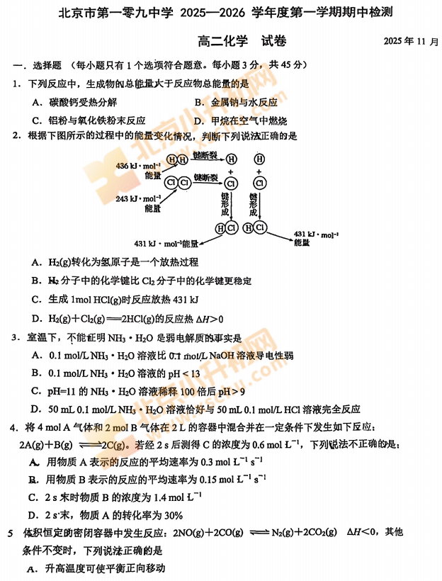 2025-2026学年第一学期北京一零九中学高二化学期中试卷及答案什么时候出?考哪些内容?如何下载?