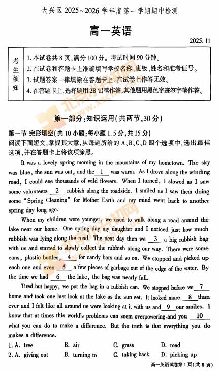 2025-2026学年第一学期大兴高一英语期中试卷及答案什么时候出?考哪些内容?如何下载?