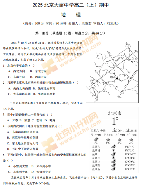 2025-2026学年第一学期大峪中学高二地理期中试卷及答案什么时候出?考哪些内容?如何下载?