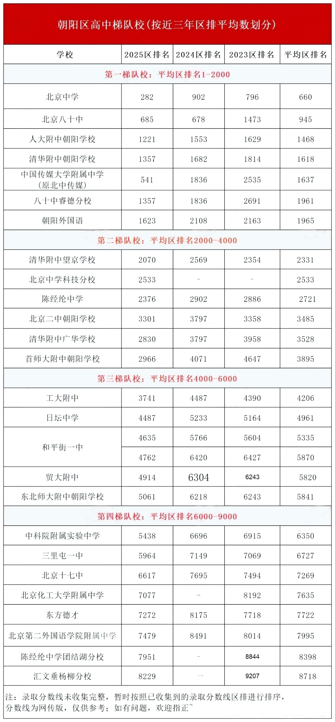 朝阳高中学校排名情况如何?2026年朝阳小升初家长、中考学生如何选择高中校?北京小升初网根据2023-2025年朝阳区排名平均分综合整理,仅供参考!