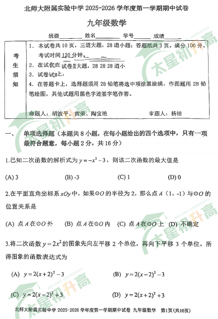 2025-2026学年第一学期北师大实验中学初三数学期中试卷及答案什么时候出?考哪些内容?如何下载?
