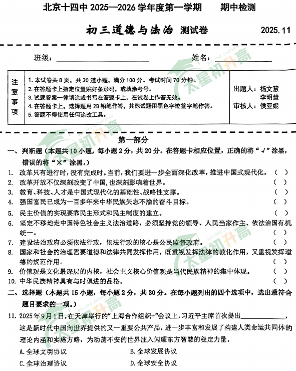 2025-2026学年第一学期北京十四中初三道德与法治期中试卷及答案什么时候出?考哪些内容?如何下载?