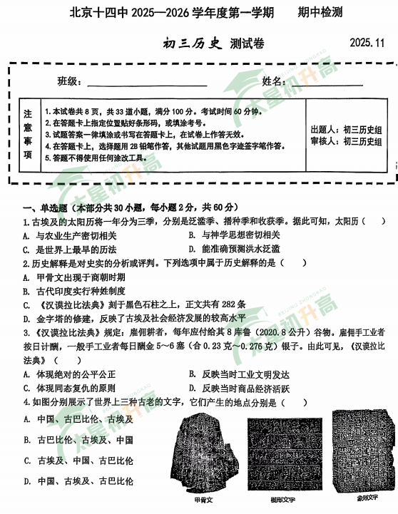 2025-2026学年第一学期北京十四中初三历史期中试卷及答案什么时候出?考哪些内容?如何下载?