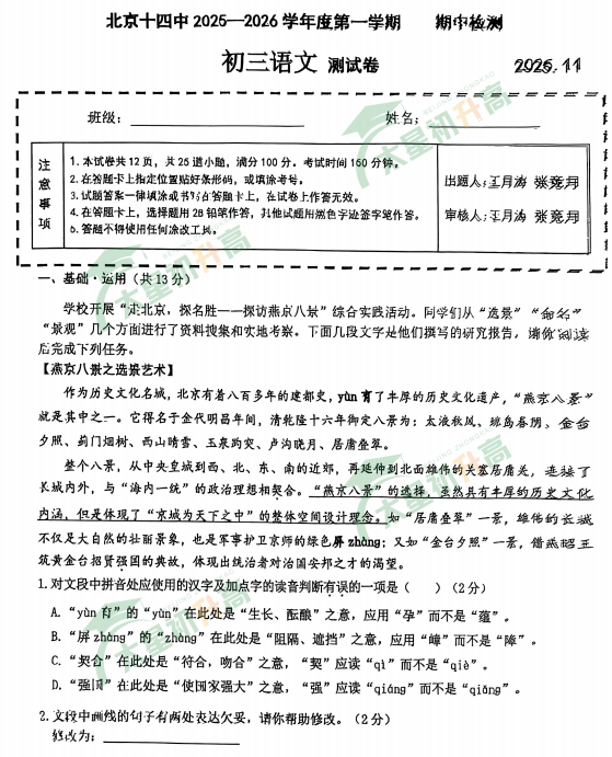 2025-2026学年(上)北京十四中初三语文期中试卷已出!文末可直接下载试卷!