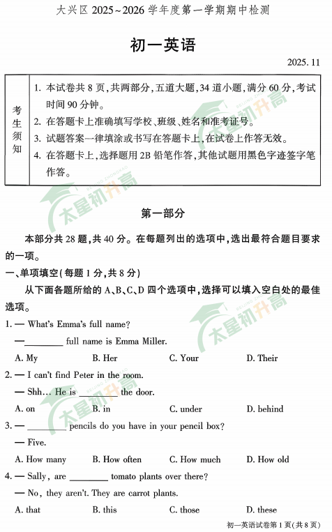 2025-2026学年第一学期大兴区初一英语期中试卷及答案什么时候出?考哪些内容?如何下载?