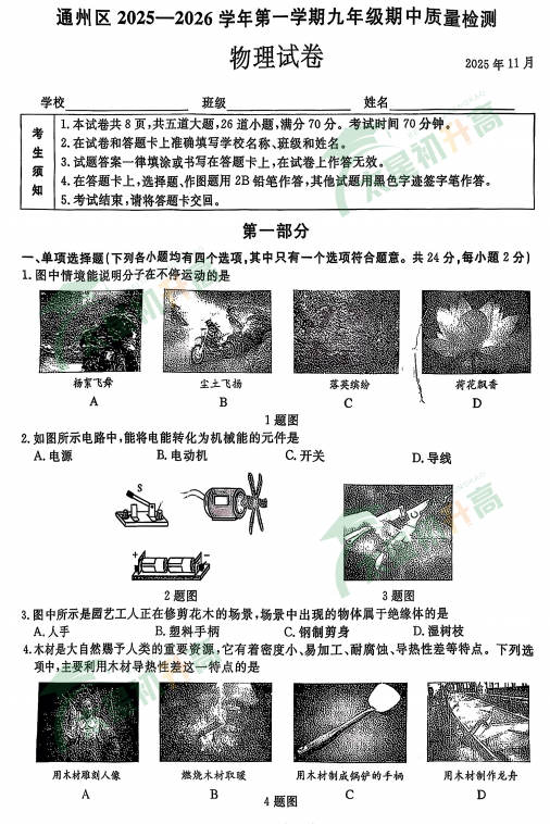 2025-2026学年(上)通州区初三物理期中试卷已出!文末可直接下载试卷!