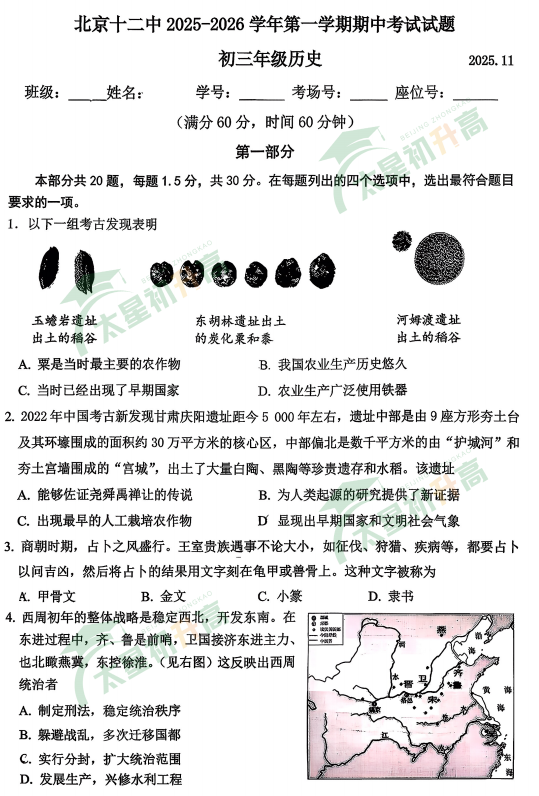 2025-2026学年第一学期北京十二中学初三历史期中试卷及答案什么时候出?考哪些内容?如何下载?