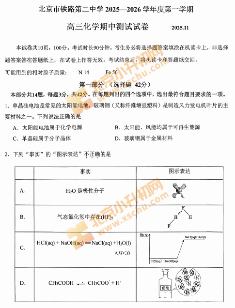 2025-2026学年第一学期北京铁路第二中学高三化学期中试卷及答案什么时候出?考哪些内容?如何下载?