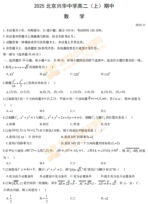 2025-2026学年第一学期北京兴华中学高二数学期中试卷及答案什么时候出?考哪些内容?如何下载?