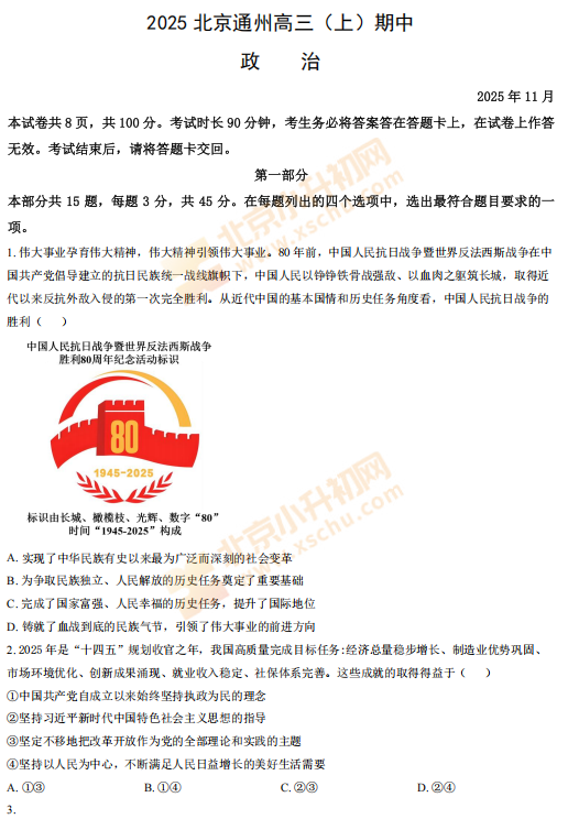 2025-2026学年第一学期通州区高三政治期中试卷及答案什么时候出?考哪些内容?如何下载?