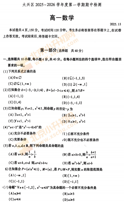 2025-2026学年第一学期大兴高一数学期中试卷及答案什么时候出?考哪些内容?如何下载?