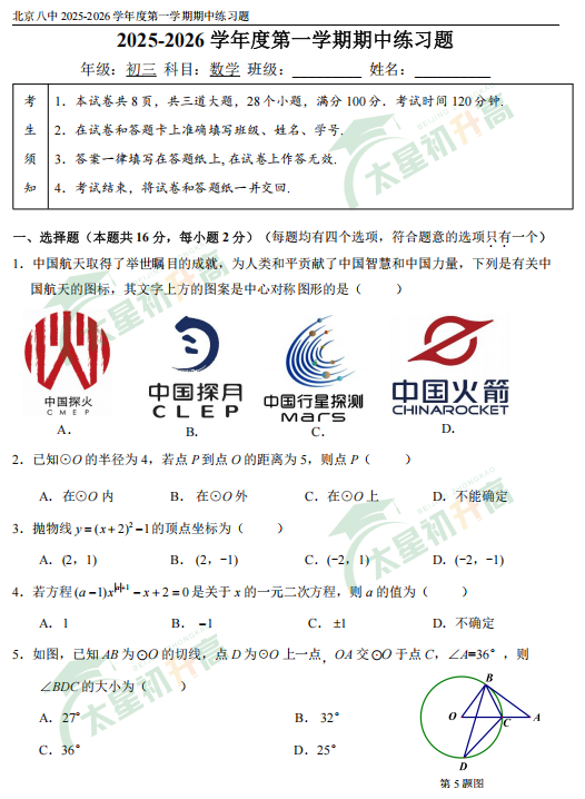 2025-2026学年第一学期北京八中初三数学期中试卷及答案什么时候出?考哪些内容?如何下载?