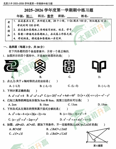 2025-2026学年第一学期北京八中初二数学期中试卷及答案什么时候出?考哪些内容?如何下载?