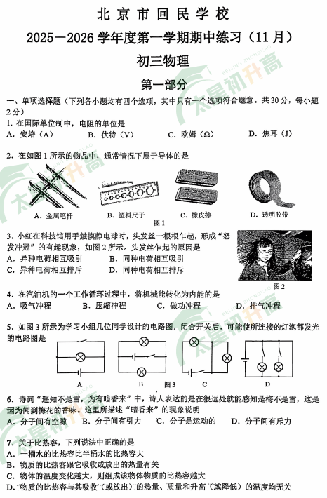 2025-2026学年第一学期北京回民学校初三物理期中试卷及答案什么时候出?考哪些内容?如何下载?