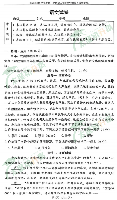 2025-2026学年(上)北京四中初三语文期中试卷已出!文末可直接下载试卷!