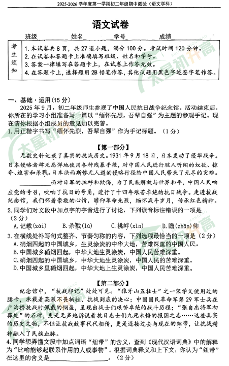 2025-2026学年第一学期北京四中初二语文期中试卷及答案什么时候出?考哪些内容?如何下载?