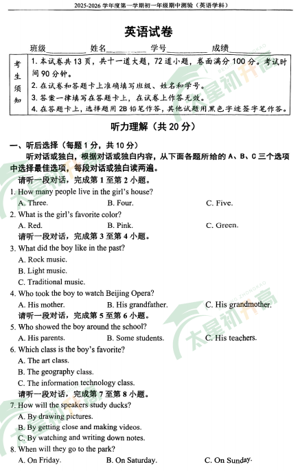 2025-2026学年第一学期北京四中初一英语期中试卷及答案什么时候出?考哪些内容?如何下载?