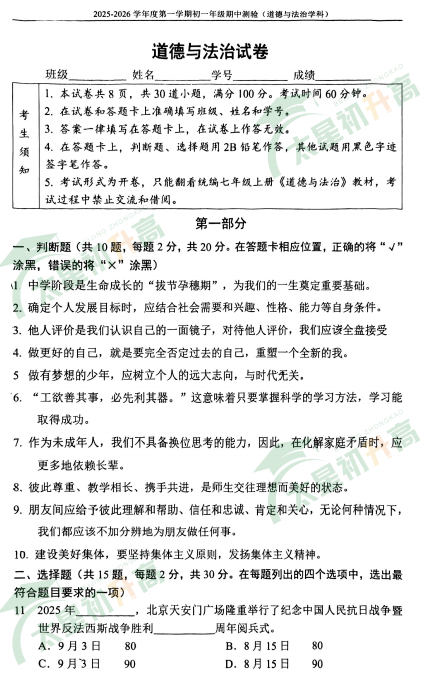 2025-2026学年第一学期北京四中初一道德与法治期中试卷及答案什么时候出?考哪些内容?如何下载?