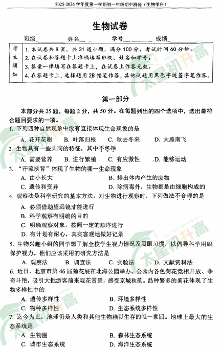 2025-2026学年第一学期北京四中初一生物期中试卷及答案什么时候出?考哪些内容?如何下载?