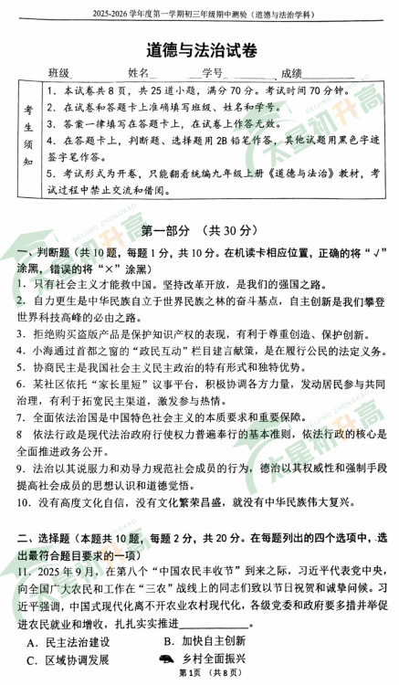 2025-2026学年(上)北京四中初三道德与法治期中试卷已出!文末可直接下载试卷!