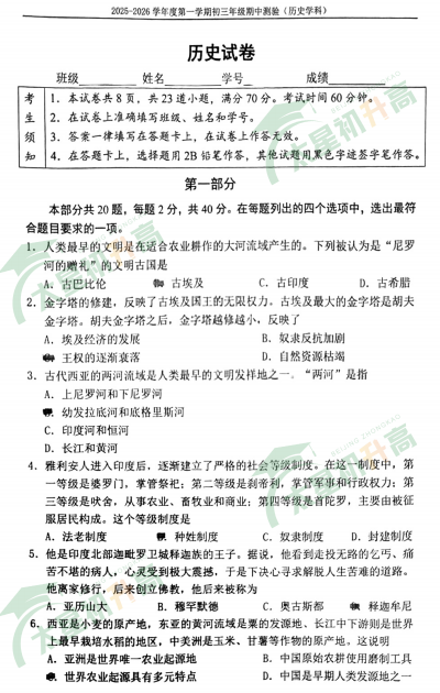 2025-2026学年第一学期北京四中初三历史期中试卷及答案什么时候出?考哪些内容?如何下载?