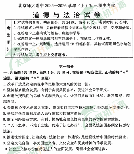 2025-2026学年(上)北师大附中初三道德与法治期中试卷已出!文末可直接下载试卷!