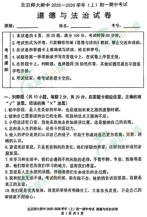 2025-2026学年第一学期北师大附中初一道德与法治期中试卷及答案什么时候出?考哪些内容?如何下载?