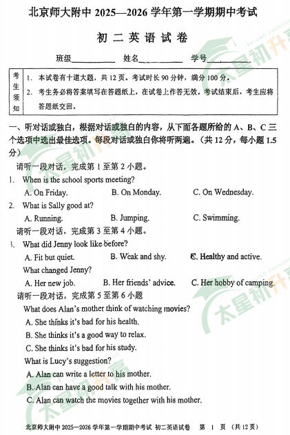 2025-2026学年第一学期北师大附中初二英语期中试卷及答案什么时候出?考哪些内容?如何下载?