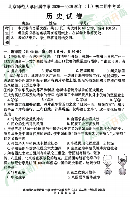 2025-2026学年(上)北师大附中初二历史期中试卷已出!文末可直接下载试卷!