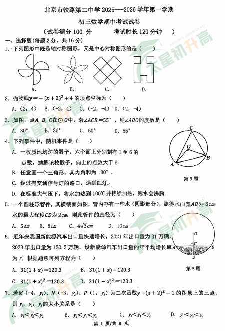 2025-2026学年第一学期北京铁路二中初三数学期中试卷及答案什么时候出?考哪些内容?如何下载?