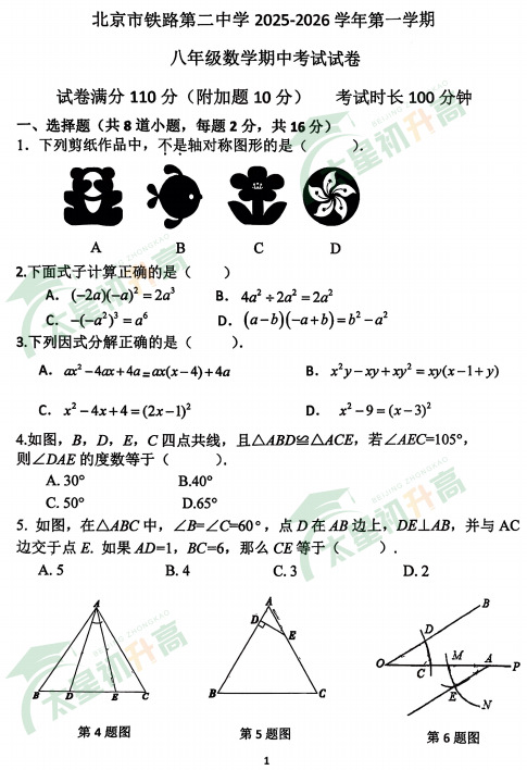 2025-2026学年(上)北京铁路二中初二数学期中试卷已出!文末可直接下载试卷!