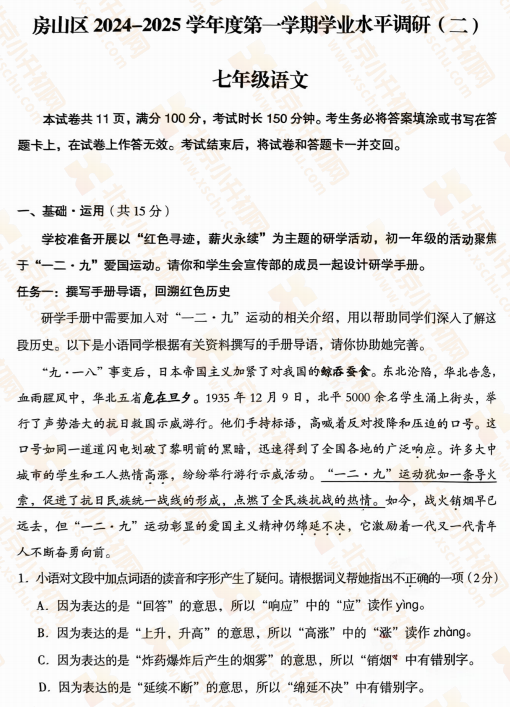 2025-2026学年(上)房山区初一期末语文试卷及答案预计在2026年1月出炉!家长可先下载去年期末试题,练习提升!新试卷公布后将更新在本页面,建议(Ctrl+D)收藏本页面!